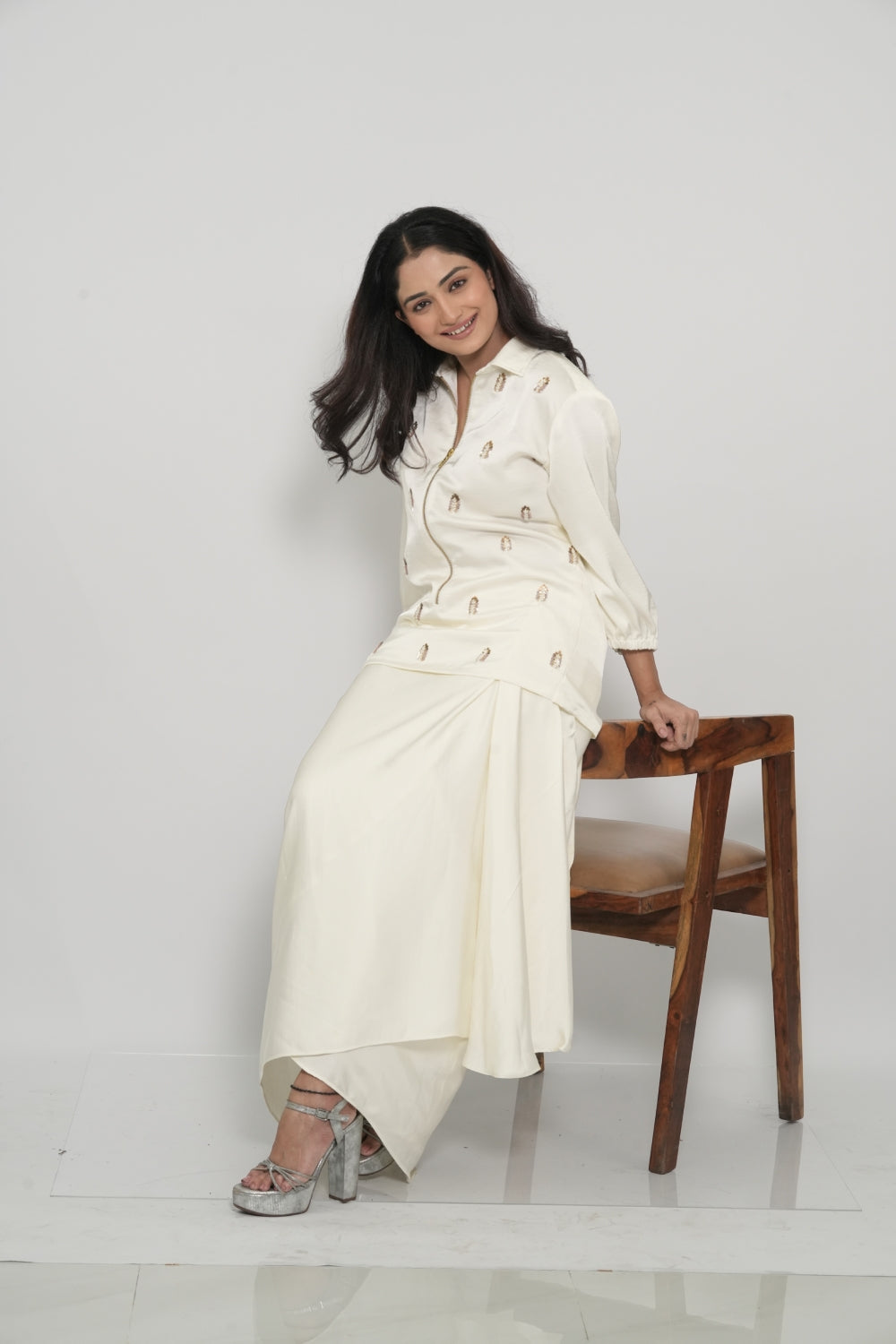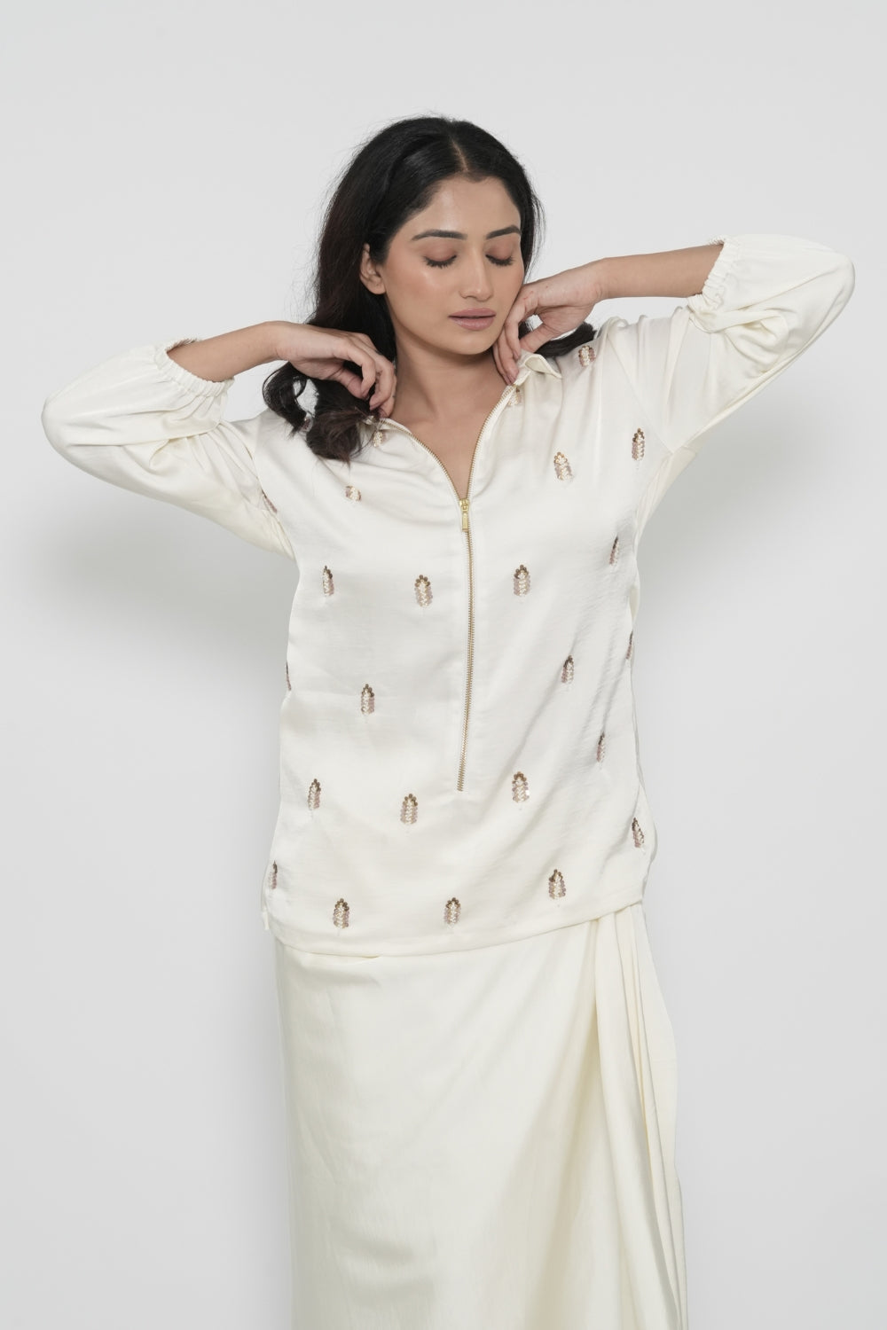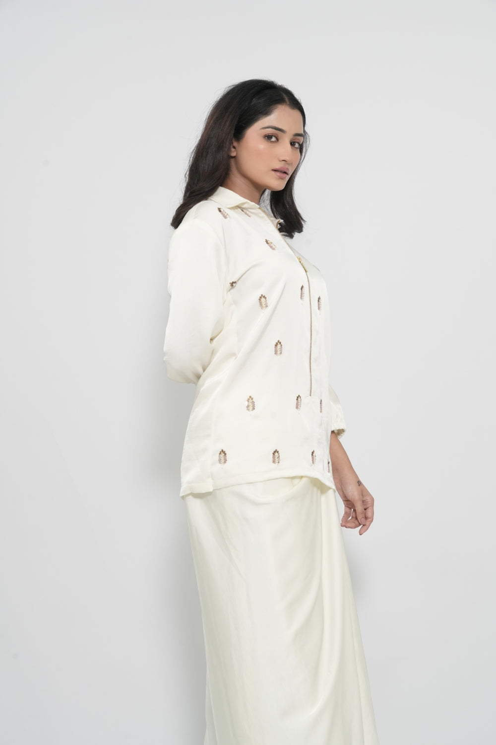 | Description | Crafted in lustrous satin, this white shirt features fine embroidery |