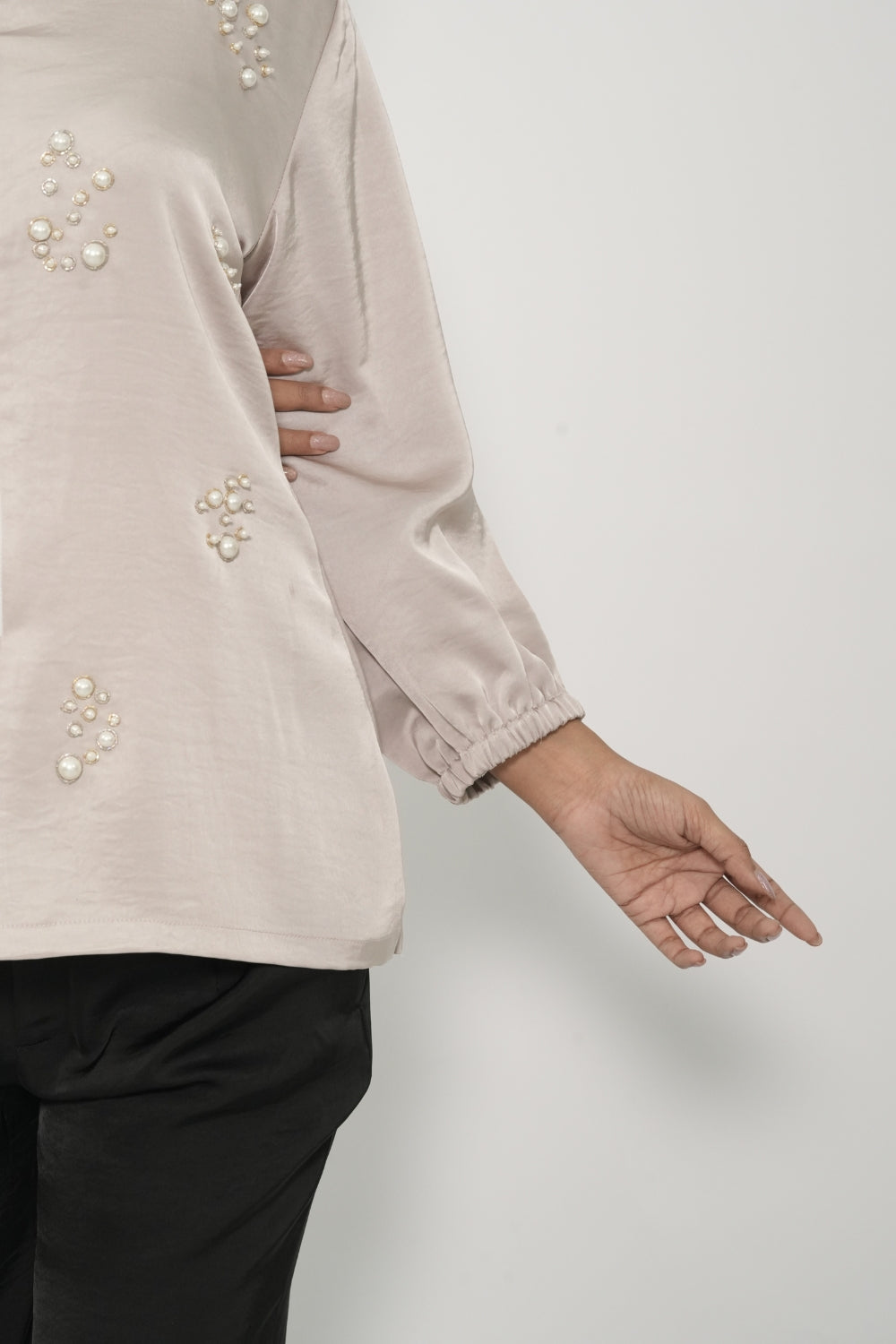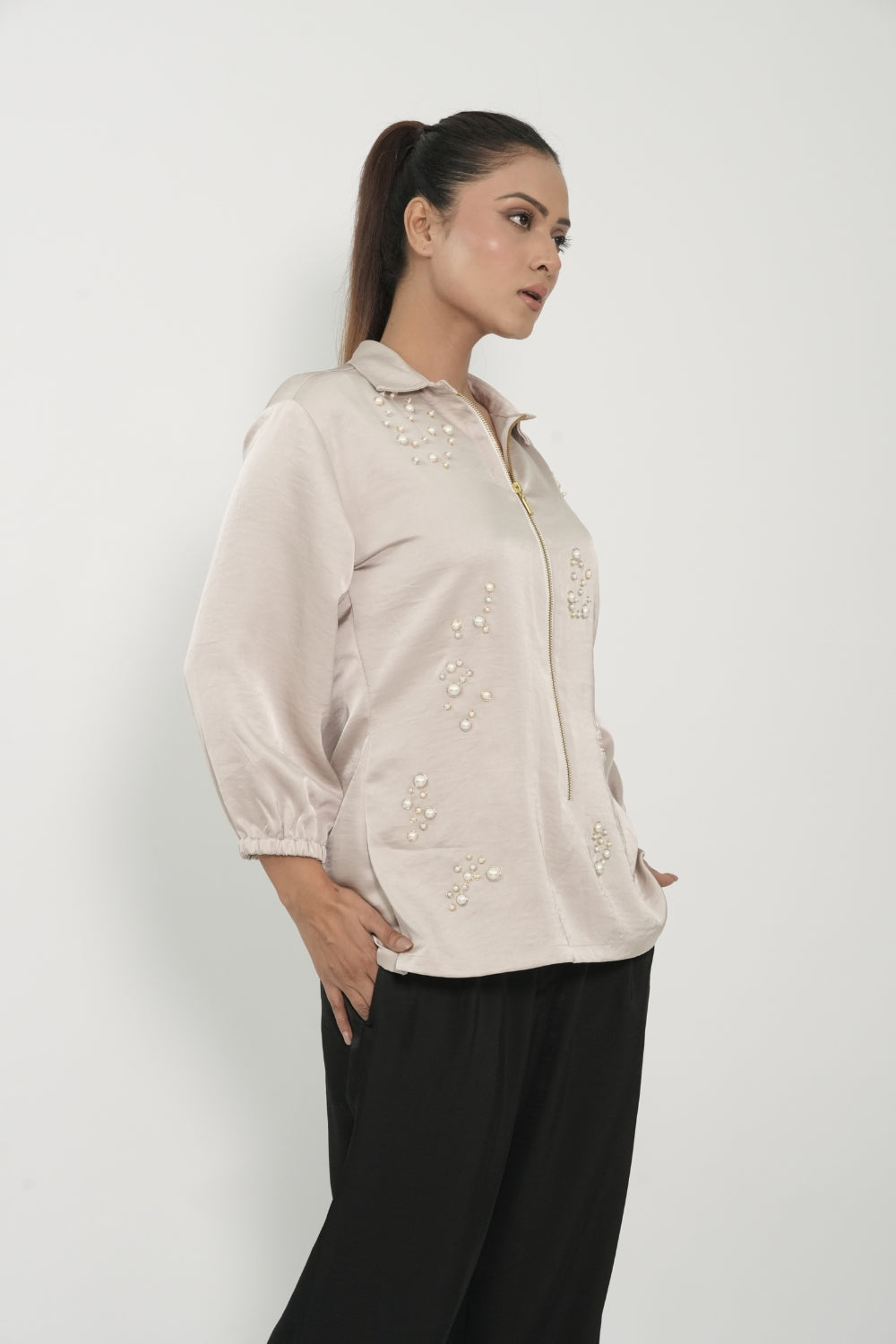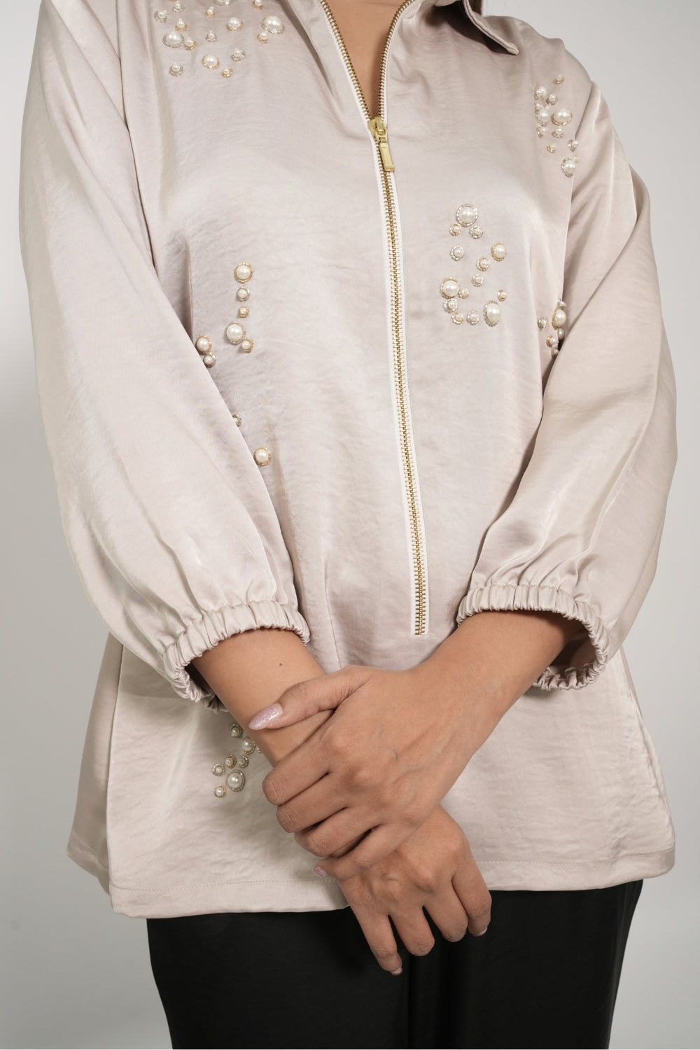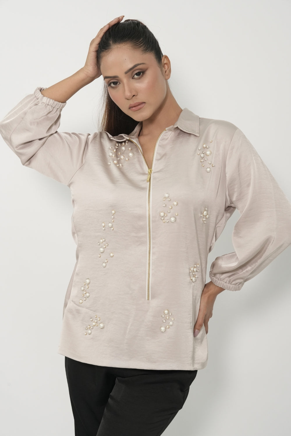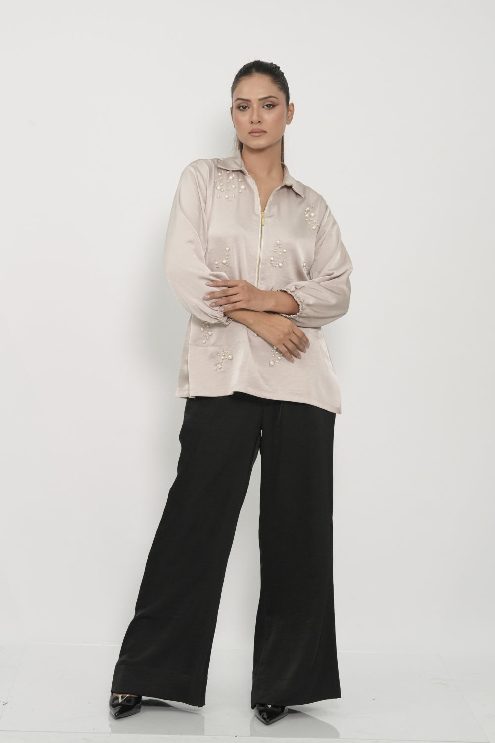 | Description | Crafted in lustrous satin, this Almond milk hue shirt features fine embroidery. |