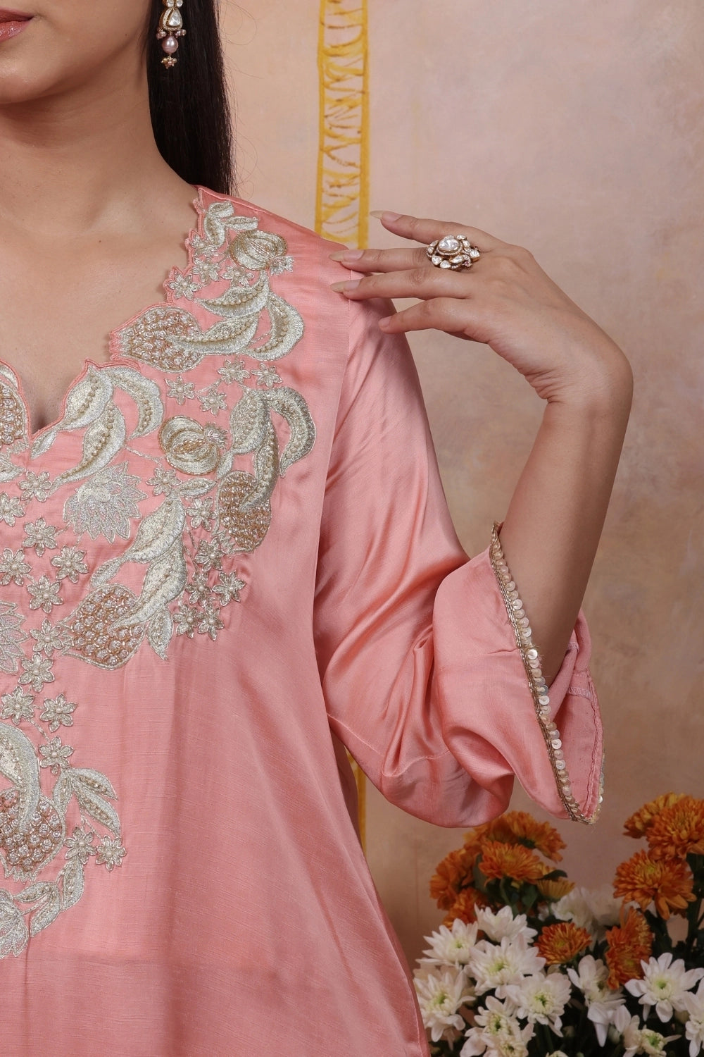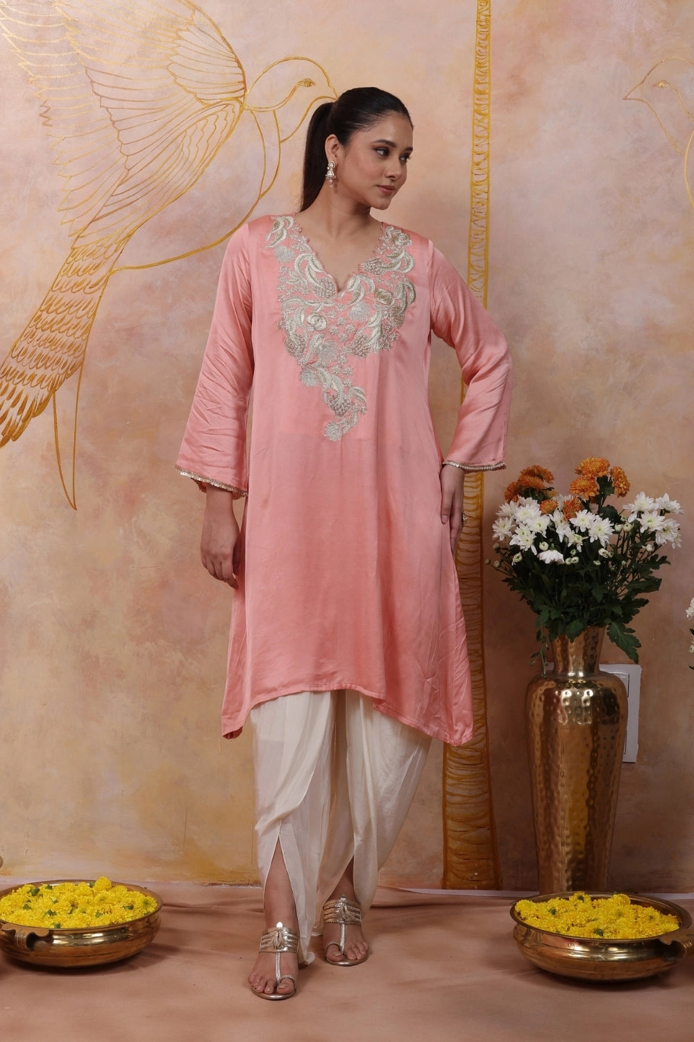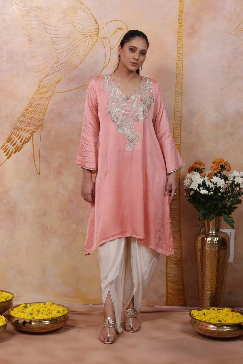 | Description | A timeless Frosted A-Line flaired kurta set with sophisticated dhoti and hand embroidery on yoke with a little touch to the sleeves to make a complete look. |