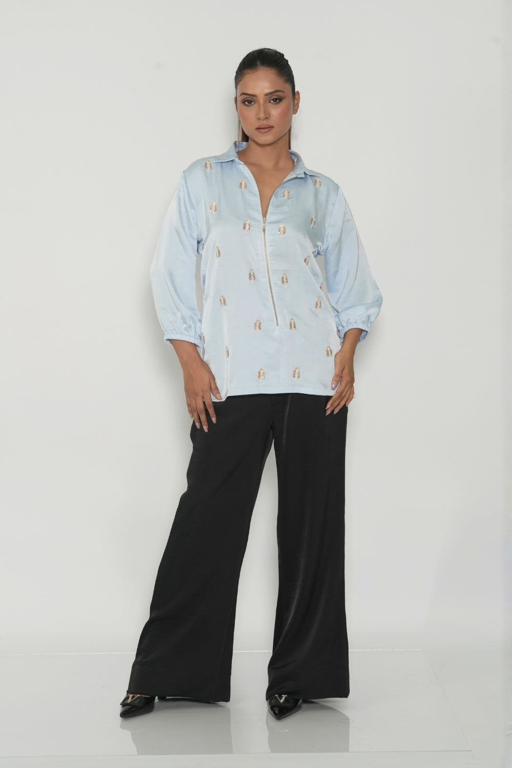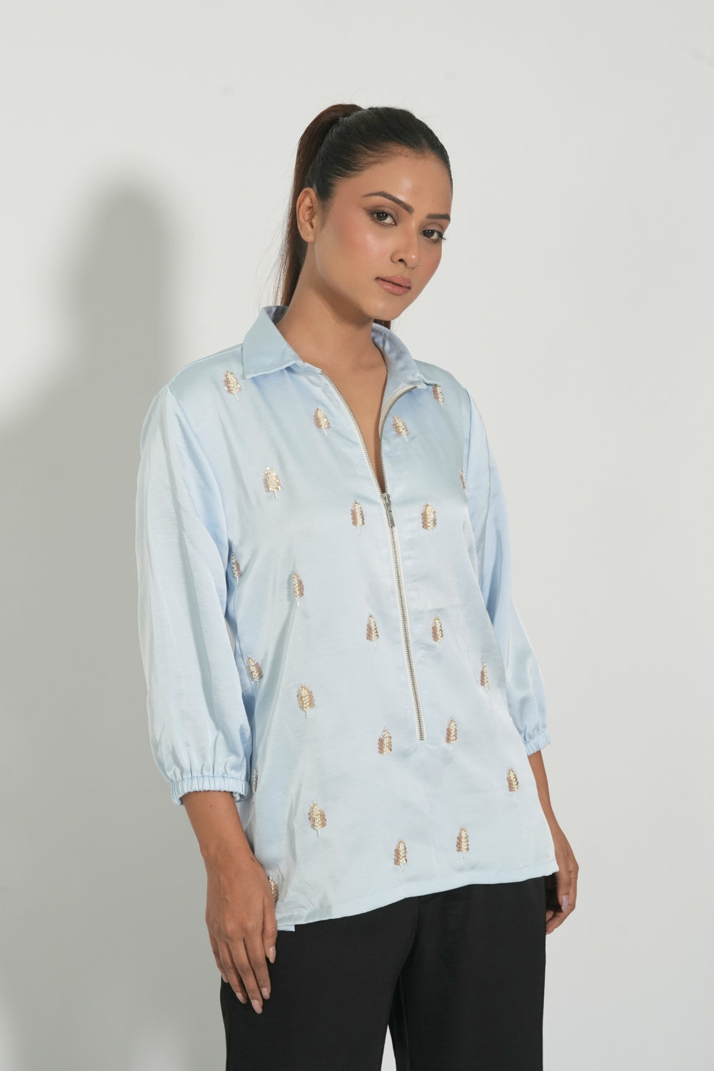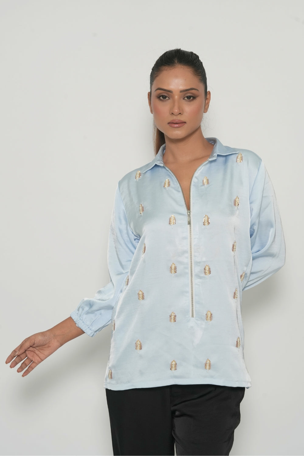 | Description | Crafted in lustrous satin, this powder blue shirt features fine embroidery. |