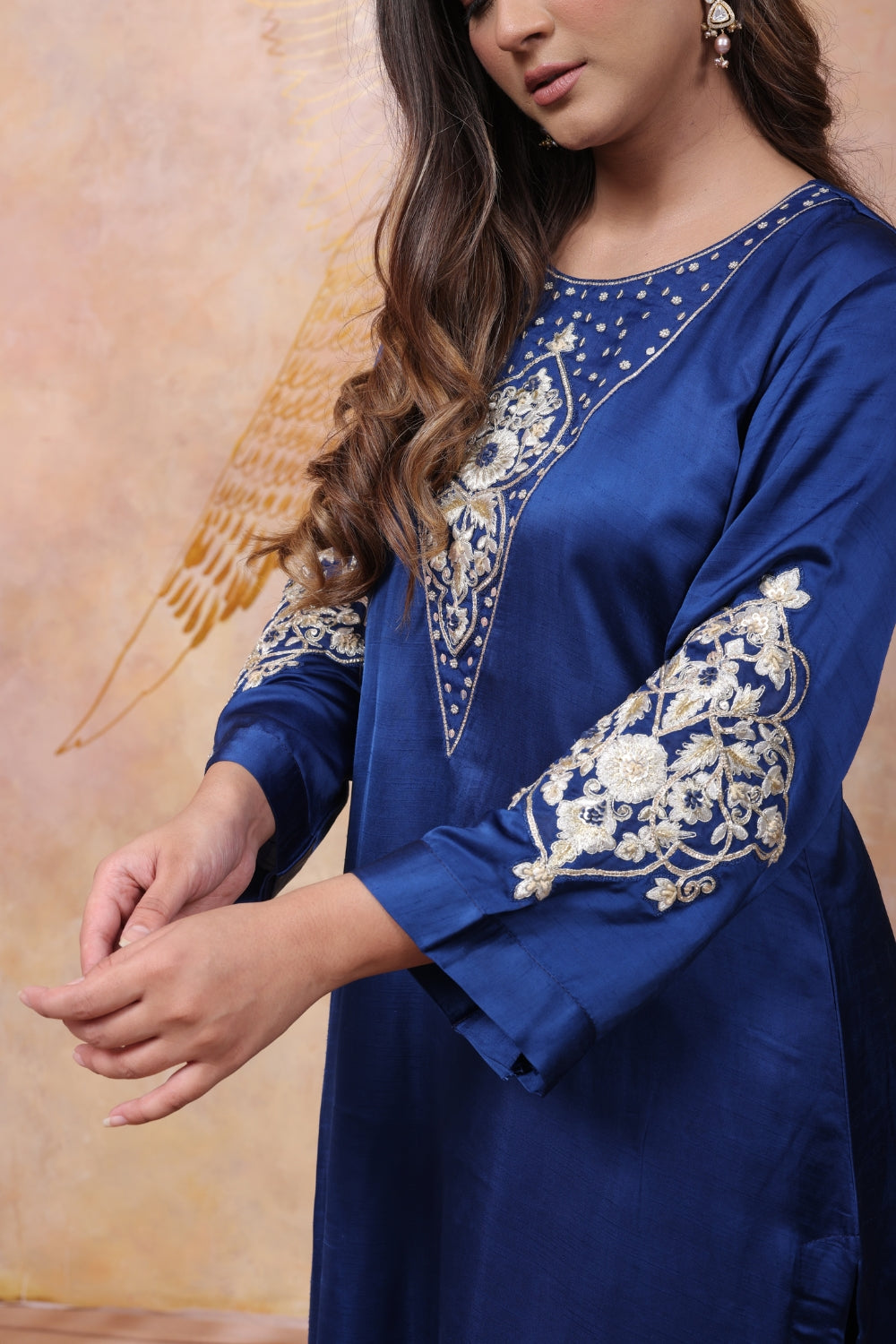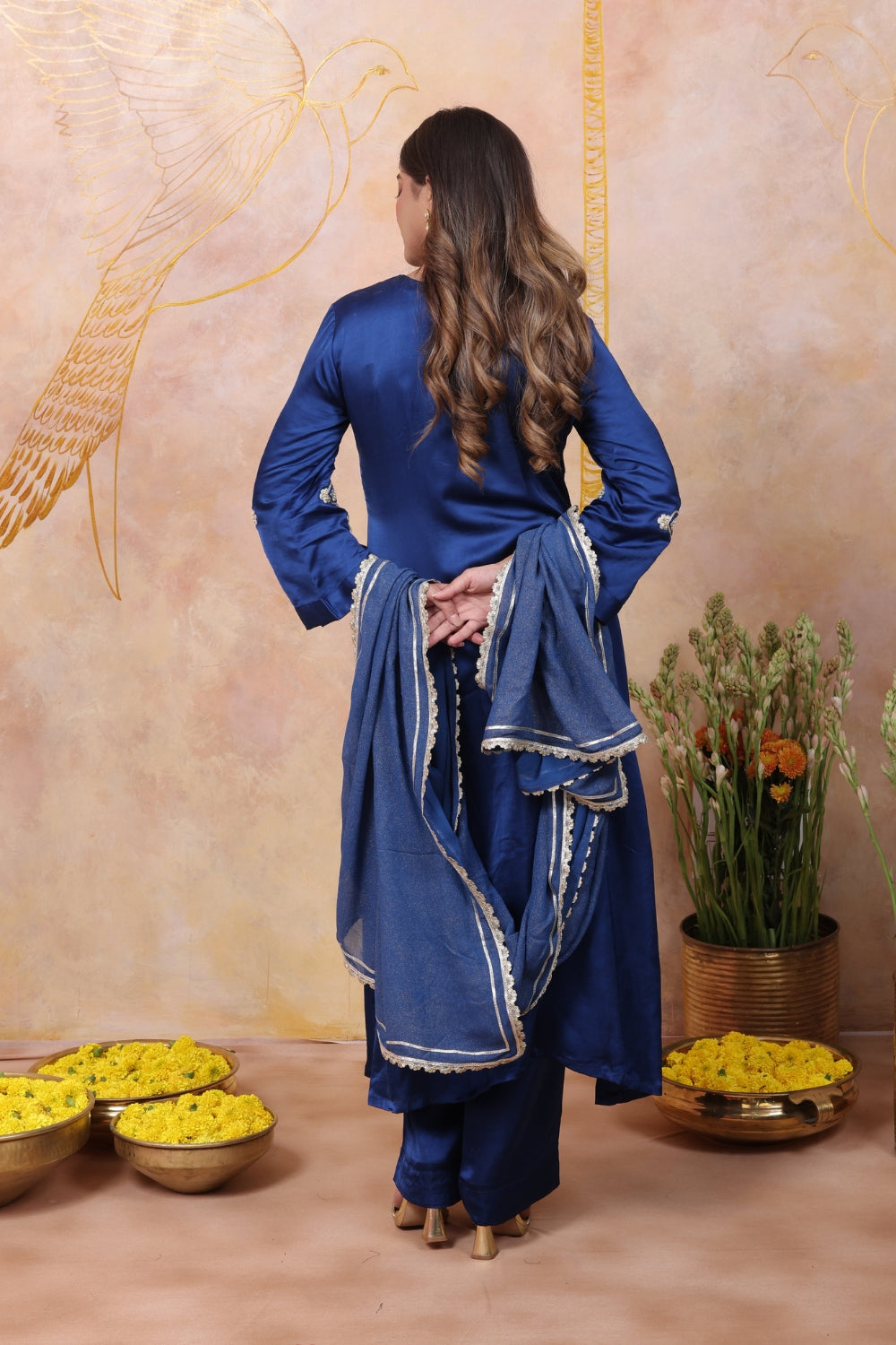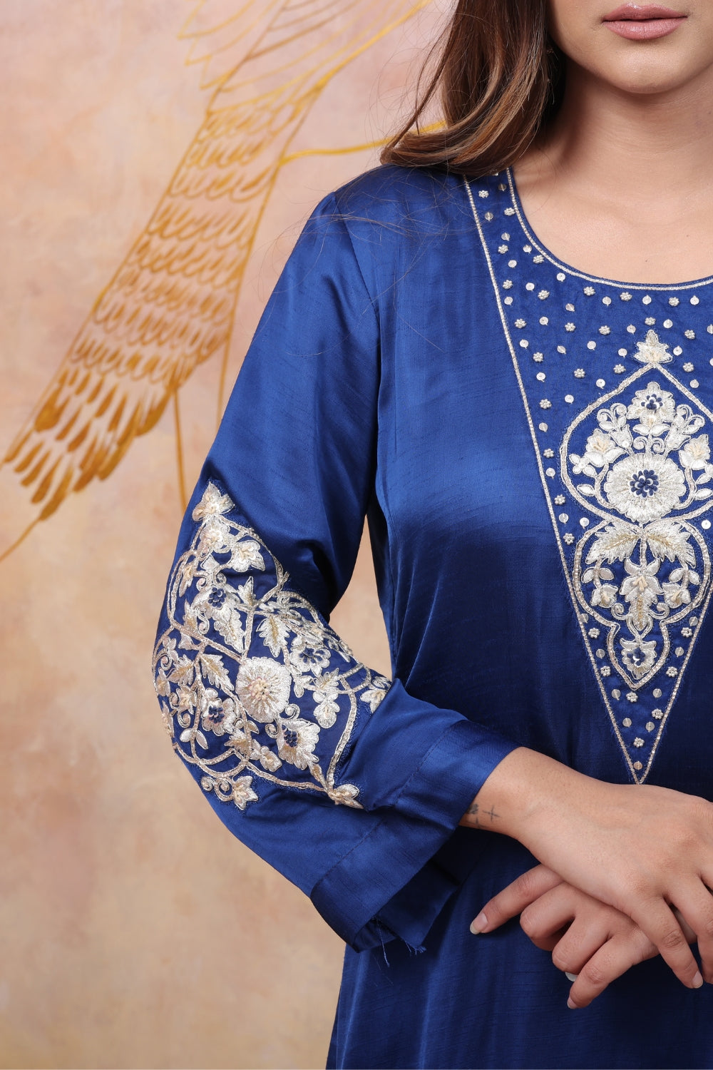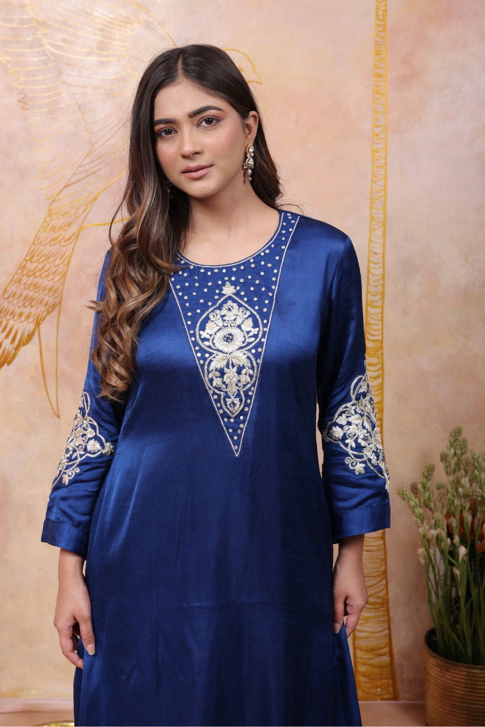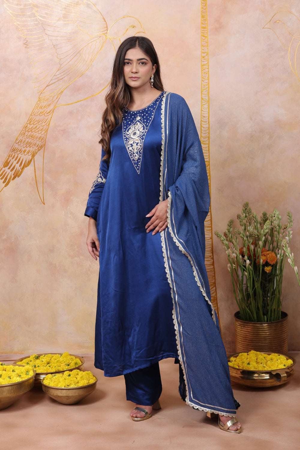 | Description | A timeless Peacock blue kurta set,with sophisticated georgette shimmer dupatta combining the overall look with embroidery details. |
