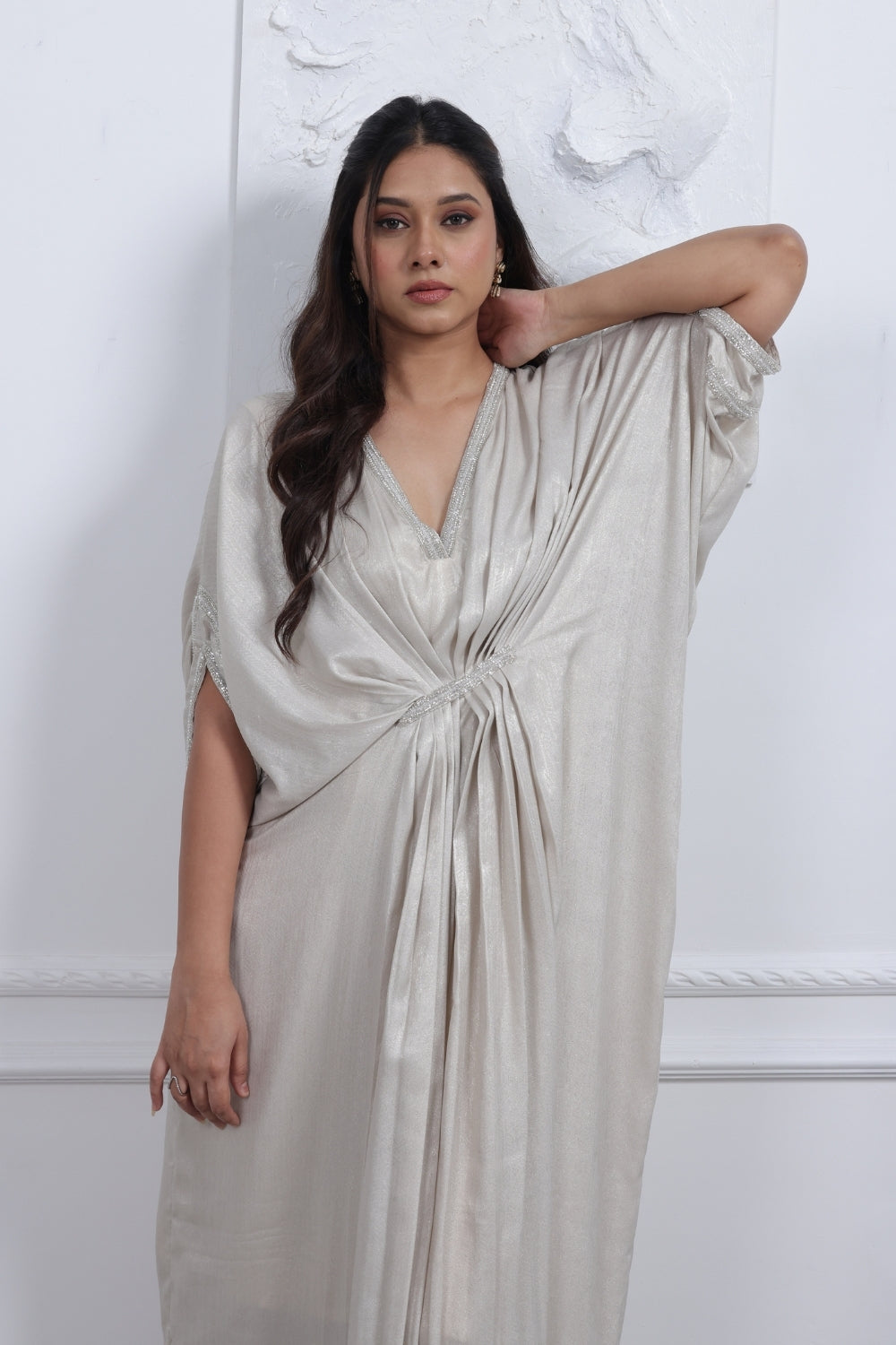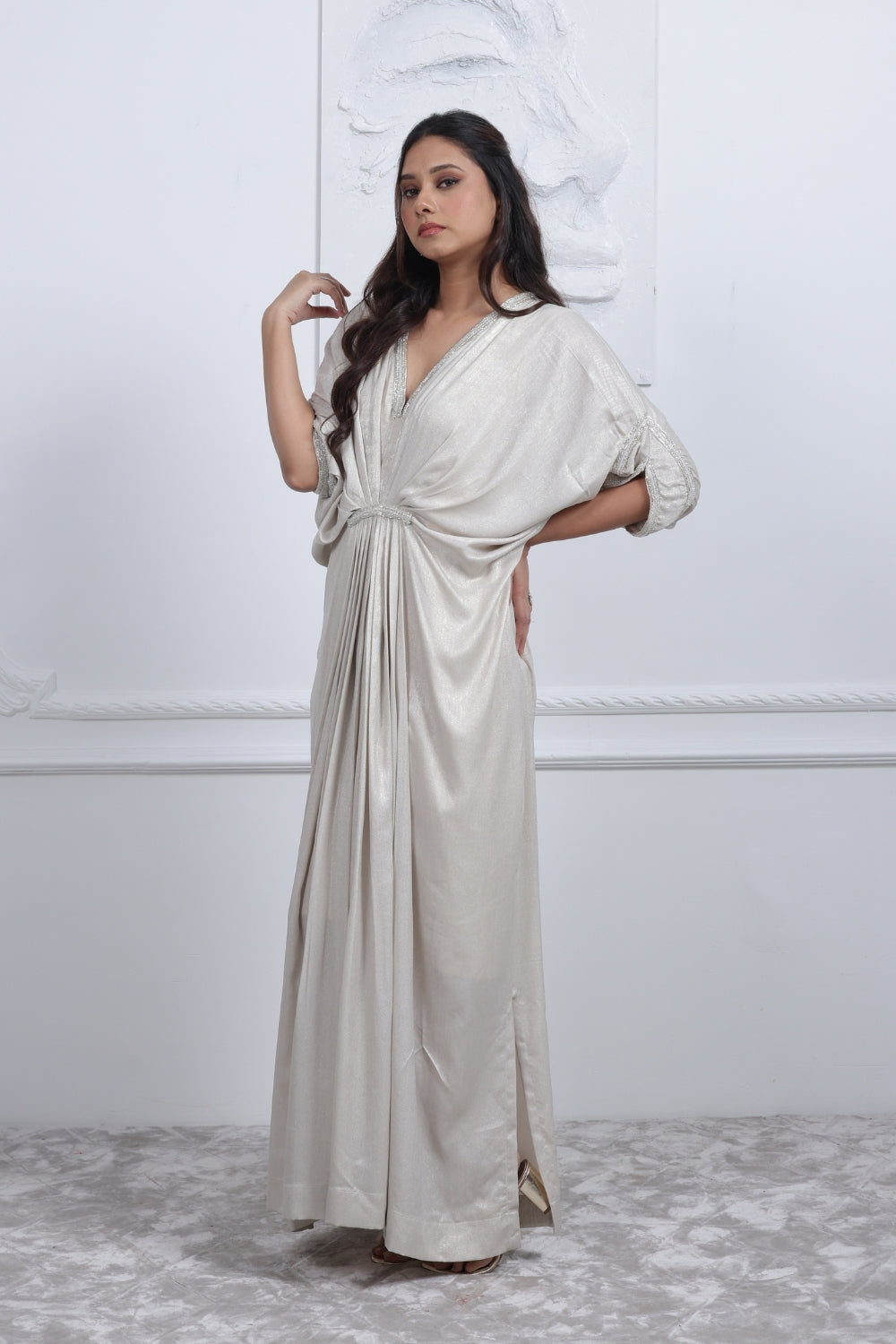| Description | A timeless Highlighter shimmer tissue drape,with sophisticated embroidery on neck with a cinched waist. |