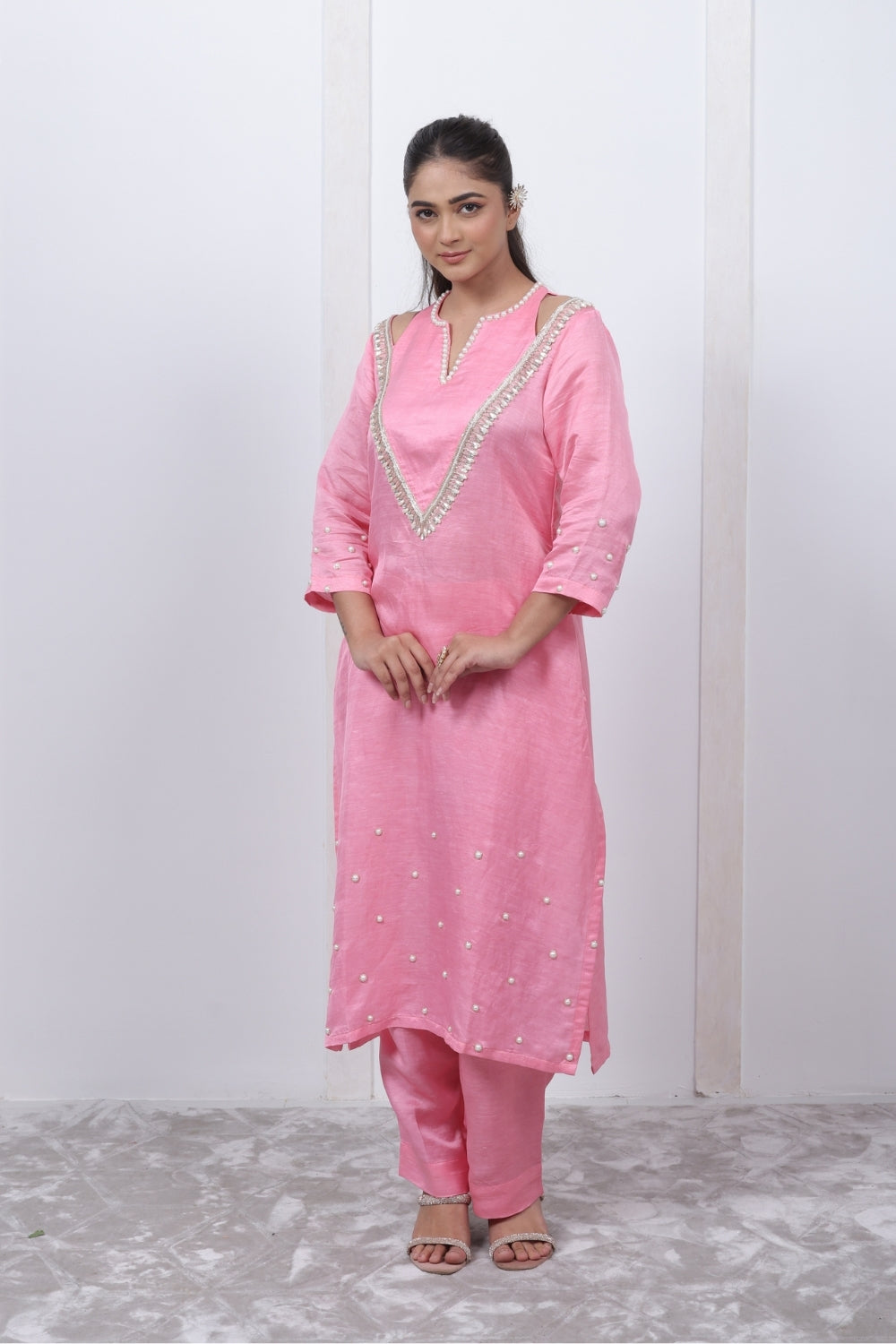 | Description | A timeless Child pink kurta set,with sophisticated embroidery on neck and on panel for a classic loook. |
