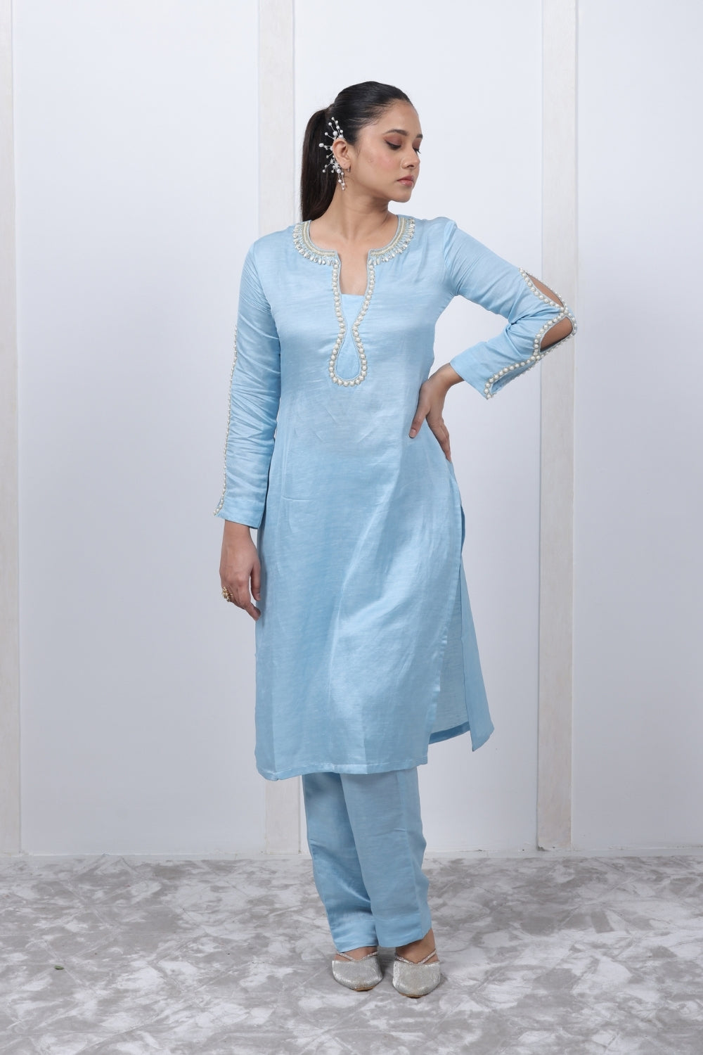 | Description | A timeless Powder Blue kurta set,with sophisticated embroidery on neck and on sleeves with a hot twist. |