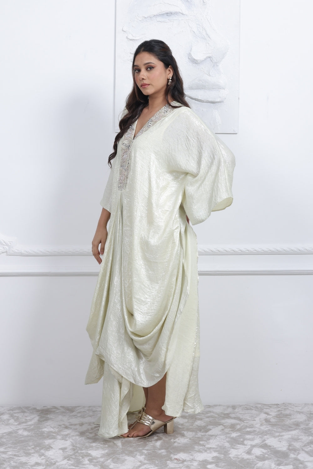 | Description | A timeless pale yellow shimmer tissue drape,with sophisticated embroidery on neck with beautiful cowls at the center. |
