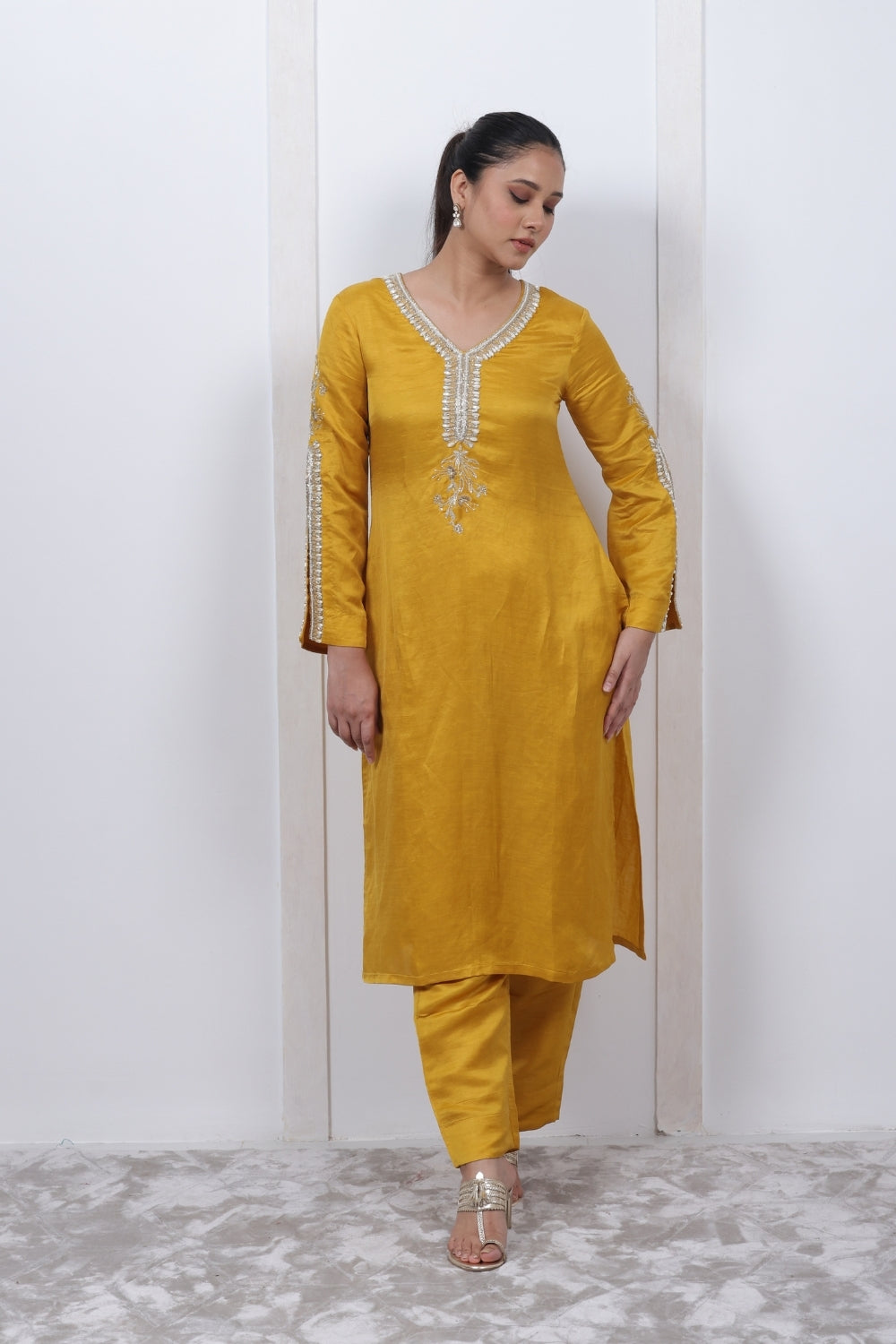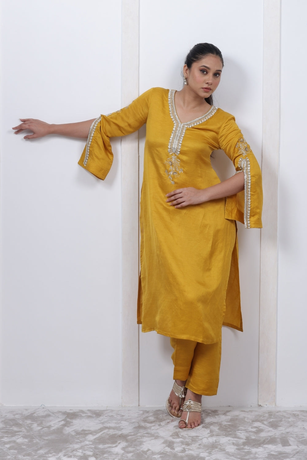 | Description | A timeless Mustard yellow kurta set,with sophisticated embroidery on yoke with dramatic sleeves. |
